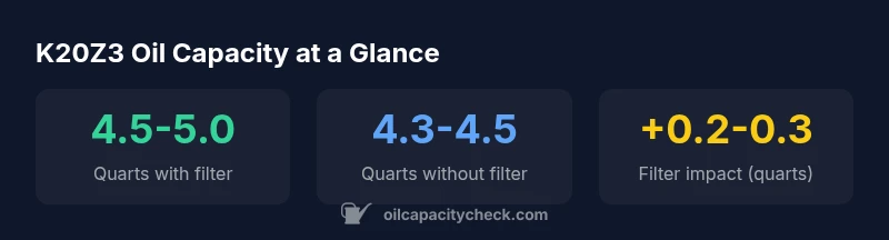 The K20Z3 oil capacity typically sits in a narrow range from about 4.5 to 5.0 quarts when you include a standard oil filter. Actual capacity depends on the exact K20Z3 variant, the filter size, and whether you drain just the pan or the filter housing as part of service. Oil Capacity Check analyses in 2026 emphasize using the correct filter and following factory specifications to avoid under- or overfilling.