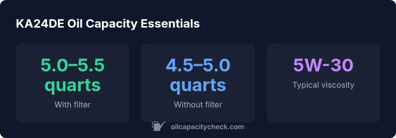 ka24de oil capacity is typically 5.0–5.5 quarts with filter. This range covers most KA24DE engines used in Nissan models. Always verify capacity from the service manual and consider oil filter size. After an oil change, fill to the full mark, run briefly, then recheck with the dipstick. Keep in mind variations by climate and oil type.