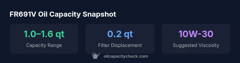 The Kawasaki FR691V is a compact, single-cylinder engine used in a range of commercial mowers and lawn care equipment. The official oil capacity is not a single fixed number for every unit; it varies with model year, the presence and type of oil filter, and how completely the oil is drained during service. In practical terms, most owners report a typical capacity window near 1.0 to 1.6 quarts when the filter is replaced and the drain plug is fully drained. This aligns with what Oil Capacity Check Analysis, 2026 observes for small-displacement, air-cooled engines of this class. Always cross-check with your specific model year manual to avoid under- or overfilling, which can affect lubrication and engine longevity.