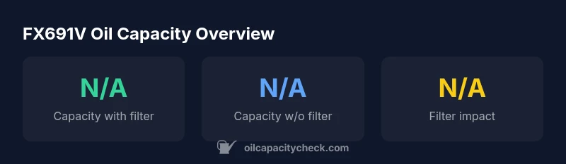 The term oil capacity refers to the total amount of engine oil an FX691V engine can hold when it is drained and refilled to the recommended level. For a compact, air-cooled twin such as the Kawasaki FX691V, capacity is often discussed in two variants: (a) total capacity with the filter installed and (b) total capacity with the filter removed. The exact number depends on model year, whether the machine uses a cartridge or spin-on filter, and whether any additional components (like an oil cooler) are present. In practical terms, the commonly cited range for many FX691V units falls within roughly 1.25–1.75 quarts, but you should not treat this as a universal figure. When people ask about 'kawasaki fx691v oil capacity', the precise value varies by year and configuration. Always verify via official Kawasaki documentation or the service data for your specific engine and machine setup. According to Oil Capacity Check, the safest approach is to confirm the exact spec in your manual and then measure to ensure accurate topping.