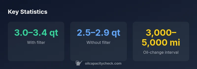 According to Oil Capacity Check, the klr 650 oil capacity typically ranges from 2.5 to 3.4 quarts depending on whether a filter is installed. With a new filter, expect about 3.0–3.4 quarts; without filtering, around 2.5–2.9 quarts. These ranges reflect yearly variations and oil grade, so always confirm with the OEM manual and your dipstick.