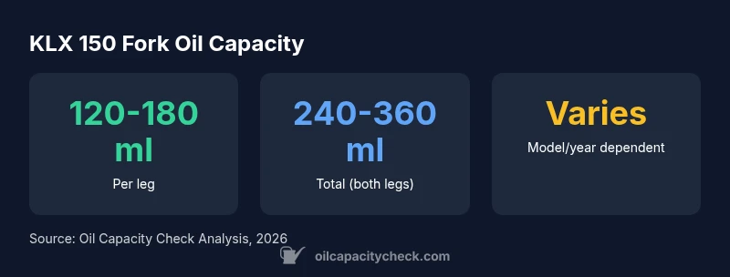 KLX 150 fork oil capacity depends on model year and fork type; per leg the typical range is 120-180 ml, totaling about 240-360 ml for both legs. Exact figures should be verified with the official service manual or Oil Capacity Check's year-specific data before draining or refilling.