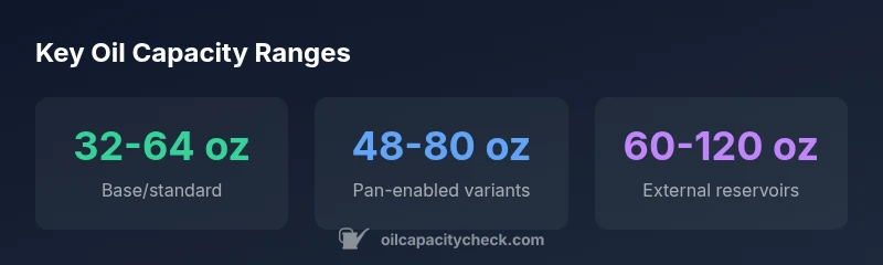 | Base engine (single sump) | 32-64 oz | Standard configuration; check manual |