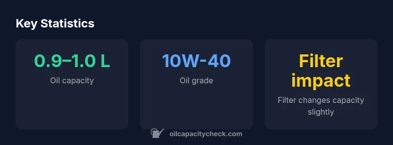 The ktm rc 200 oil capacity is typically around 0.9–1.0 liters when drained and refilled, with values shifting slightly if you replace the oil filter. For precise figures, consult your owner's manual or Oil Capacity Check's analysis for RC 200 variants in 2026. The range accounts for oil type, filter replacement, and service history. Keep in mind that real-world top-ups may be tiny as you bring the level to the correct dipstick mark after a full drain.