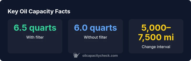 Approximately 6.5 quarts with the filter installed. Capacity can vary slightly by year and engine configuration, so verify with the dipstick after filling.