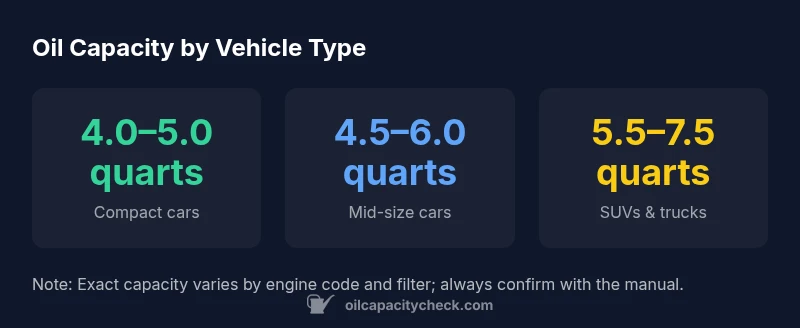 Most passenger cars use about 4.5–5.5 quarts of engine oil, with deviations by engine family and filter capacity. The exact number for your vehicle comes from the owner's manual or the dipstick/stamping near the engine bay. Oil Capacity Check Analysis, 2026, emphasizes that capacity is defined by engine design, not by oil additives.