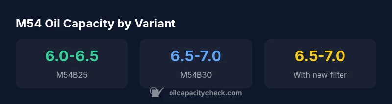 According to Oil Capacity Check Analysis, the M54 oil capacity ranges from 6.0 to 7.0 quarts (5.7–6.6 L) depending on variant and whether you replace the filter. For most M54B30 engines with a fresh filter, expect about 6.5–7.0 quarts when performing a full fill. Verify with the dipstick after refilling.