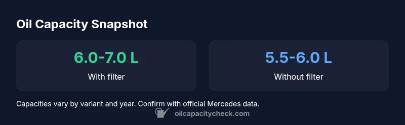 Capacity varies by engine variant and year. Typical ranges are 6.0-7.0 L with a new filter; without a filter, 5.5-6.0 L. Always confirm with Mercedes service data for your VIN.