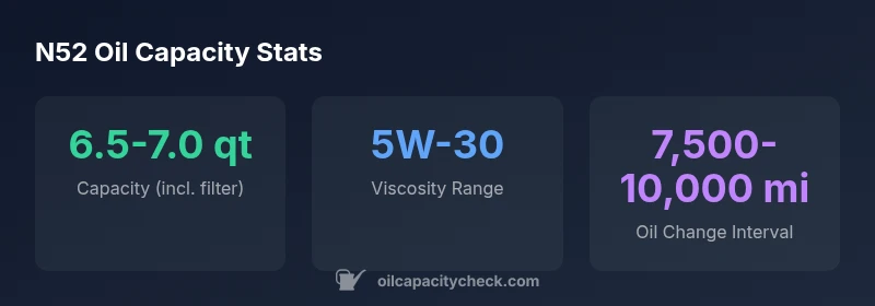 For the N52 family, the calculated capacity typically falls within a narrow range, but exact figures vary by model year and equipment. Always consult the factory service data for your specific vehicle. Oil Capacity Check recommends confirming with the owner’s manual and performing a cautious fill followed by a dipstick check to verify the final level.
