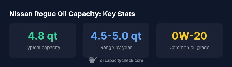 The Nissan Rogue oil capacity is typically around 4.8 quarts with a full oil change and new filter. Most Rogue models in the 2.5L I4 family vary between about 4.5 and 5.0 quarts depending on year and trim. Always confirm exact capacity from the owner's manual and measure after pouring to avoid overfilling.