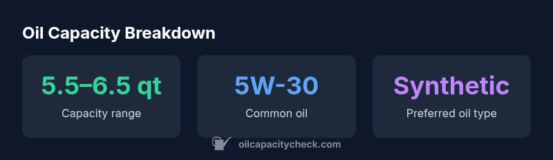 The exact figure depends on the engine variant and year. In practice, expect a range around 5.5–6.5 quarts with the filter included. Verify against your VIN-specific data in the owner's manual.
