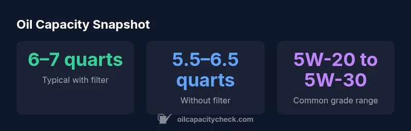 Typically 6–7 quarts with filter; confirm for your year and model.