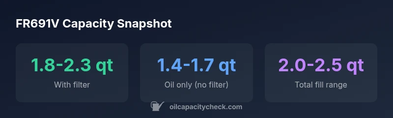 The FR691V oil capacity is typically around 2 quarts with a new filter, with a practical range of about 1.8-2.3 quarts depending on the filter and version. Always verify with the operator’s manual for your exact model.