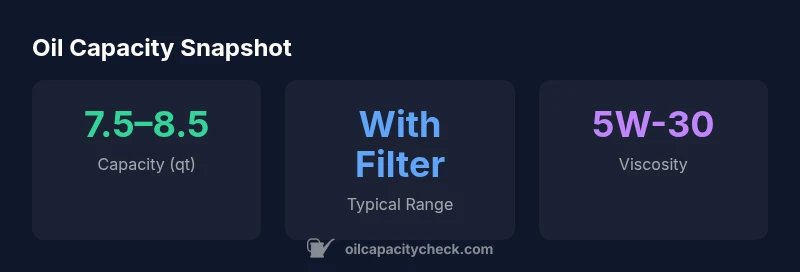 The capacity is typically around 8 quarts with the oil filter, with a practical range of 7.5 to 8.5 quarts depending on year and filter. Always verify for your exact year.