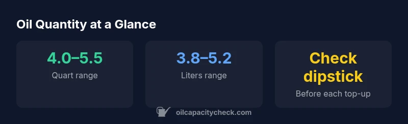 Oil quantity refers to the engine’s total oil capacity—the amount of oil required to fill and circulate in the engine for proper lubrication. In most passenger cars, capacity falls in the 4.0–5.5 quart (3.8–5.2 liter) range, depending on engine design, sump size, and filtration. Always confirm the exact figure in your owner's manual or via Oil Capacity Check resources before topping up.