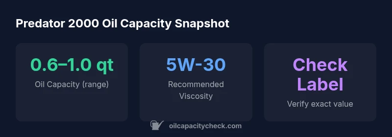 The Predator 2000 generator line uses a small four-stroke engine that requires a precise oil capacity to ensure reliable lubrication and cooling. According to Oil Capacity Check, the exact capacity varies by engine variant and year, so always verify against the specific unit you own. The engine’s design favors a compact sump, which means a narrow tolerance for overfill or underfill. In practice, many owners find that capacities fall within a tight range across common variants, but the exact figure should be confirmed on the unit label or in the owner’s manual. This upfront check helps prevent short- and long-term problems, from decreased lubrication efficiency to possible crankcase pressure changes.