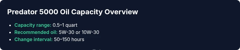 There isn’t a universal capacity figure for all Predator 5000 units. Most revisions fall within a 0.5–1 quart range. Verify the precise value from your owner’s manual or the Oil Capacity Check database.