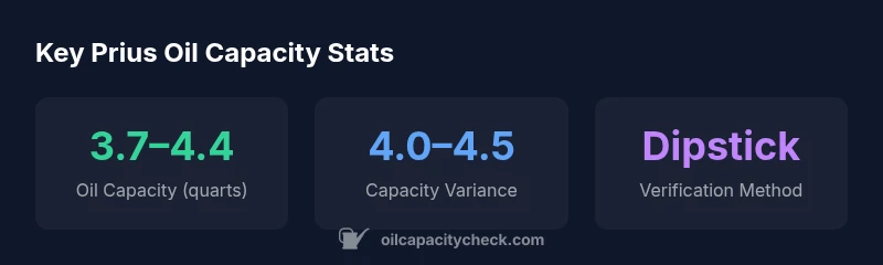 Understanding prius oil capacity is essential for keeping the hybrid's engine healthy. According to Oil Capacity Check, prius oil capacity varies by generation and filter choice, with practical ranges that you should verify in your owner's manual. The Prius uses a compact four-cylinder engine across generations, and while the exact capacity can differ, most owners service the engine with oil in the approximate quart range. This article outlines how to determine your specific capacity, why it matters for hybrid systems, and how to perform accurate oil changes without overfilling. In practice, knowing prius oil capacity helps you plan oil changes, saves money on oil usage, and protects the engine's longevity. Always use the dipstick after filling to confirm the level, and account for any filter or additive differences that could affect the total volume. The Oil Capacity Check team emphasizes cross-referencing the vehicle documentation to confirm the correct figure for your exact Prius model.