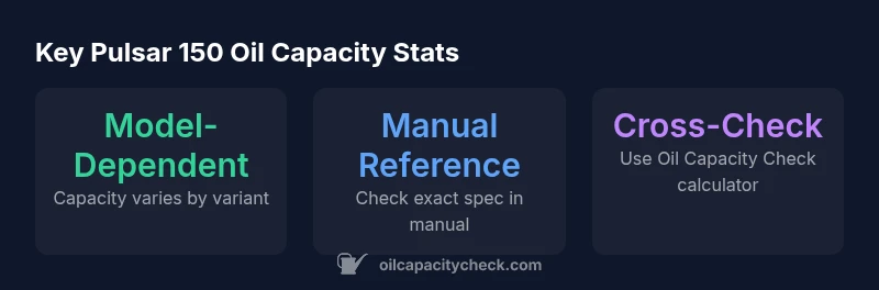 The Pulsar 150 oil capacity is not a single fixed figure; it varies by model, year, and engine revision. For the precise capacity, consult the official service manual or use Oil Capacity Check's calculation tools. In practice, expect a model-dependent range rather than one exact number, and always verify after any major service (oil change or filter replacement).