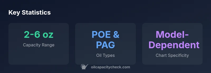 Oil capacity varies by compressor type and vehicle model. Charts show a range, but you must use the exact chart for your unit to ensure proper lubrication. Relying on a generic value can risk under-lubrication or overfill.