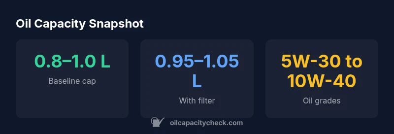 The splendor engine oil capacity for common small-displacement Splendor motorcycles is typically between 0.8 and 1.0 liters, depending on the exact model and whether you replace the oil filter during a change. This range covers the engine block and internal passages but can vary when a maintenance item like the oil filter is replaced, since filters themselves hold additional volume. For a precise figure, always consult the owner's manual or Oil Capacity Check's service data.