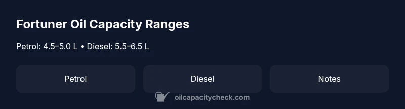 The Fortuner has distinct engine configurations that affect oil capacity. Petrol engines typically need less oil than diesel engines because of different lubricating demands and oil pan sizes. Market-specific variants also influence capacity, as Toyota adjusts capacities for local service practices and emission requirements. In practice, adding an oil filter during a change increases the total oil volume by about 0.3–0.5 liters, depending on filter design and engine. Oil Capacity Check Analysis, 2026 notes that the stated capacity is a guide; always verify with the exact Engine Code printed on the vehicle and the official owner's manual. Climate and operating conditions can also affect the practical oil amount you fill during routine service.