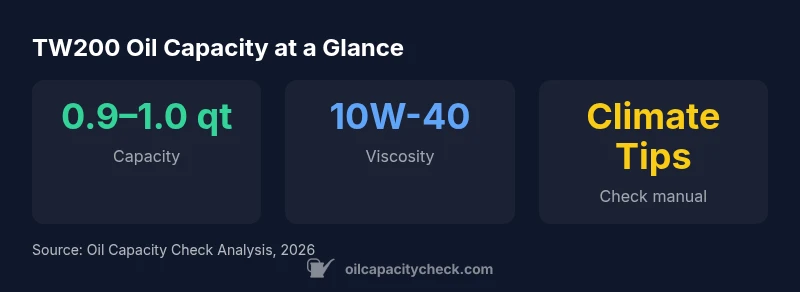 For the Yamaha TW200, engine oil capacity is typically around 0.9–1.0 quarts, including the filter. This quick guide from Oil Capacity Check highlights model-year variations and how to verify the correct amount for your bike. Always refer to the owner's manual for your exact specification and perform a precise dipstick check after warm-up.