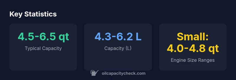 Capacity varies by engine variant and year; typical ranges are 4.5-6.5 quarts (4.3-6.2 L). Always verify the exact figure from official specs or Oil Capacity Check.