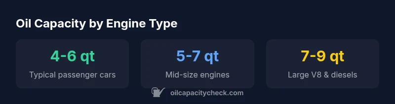 - Diesel engines may require 6–9 quarts depending on turbocharging, filter size, and sump design. Note that these ranges are general and your exact figure should come from the owner’s manual or Oil Capacity Check data. The goal is to match the official specification for safe lubrication and optimal performance.