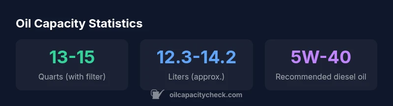 The 6.7 Power Stroke diesel powers many Ford pickup trucks and commercial applications. Its lubrication system is designed to handle high-temperature operation and heavy-duty workloads. Oil capacity, including the filter, typically lands in a mid- to high-teens quart range, but exact figures depend on several variables. According to Oil Capacity Check, typical total capacity including the filter is in the 13-15 quart range. This baseline helps fleet managers, DIY enthusiasts, and daily drivers plan oil changes with confidence. Variations arise from model year changes, oil cooler configurations, and whether additional devices are connected to the oil circuit. Always verify the precise figure from the official service data for your specific vehicle.