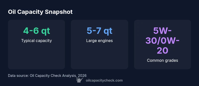 Oil capacity is the total amount of engine oil your engine can hold, and it varies by make, model, and engine family. For most passenger cars, the capacity typically falls between 4 and 6 quarts, while some larger engines need about 5 to 7 quarts when performing an oil change with a new filter. Always verify with the owner's manual or the manufacturer’s specifications, and use the recommended oil grade (often 5W-30 or 0W-20).