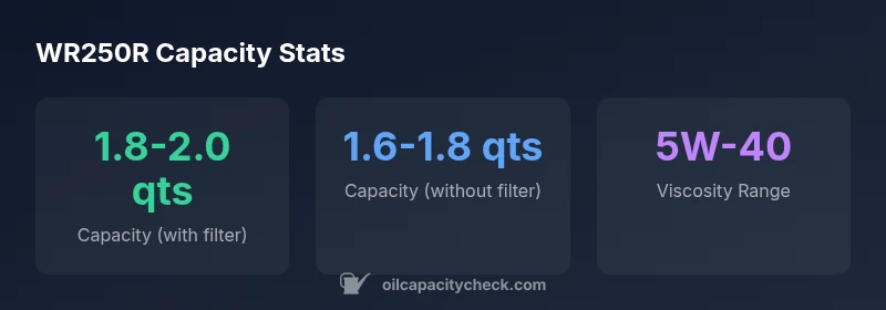 Oil capacity is the total amount of oil the engine’s crankcase can hold after a complete drain and replacement, including the oil that remains in the filter. For the WR250R, capacity is influenced by the engine’s internal design, gasketed passages, and whether you count the filter’s volume. The number matters because over time, riders who consistently top off without draining or who misread the dipstick can end up with oil levels that are too high or too low. Oil Capacity Check analyses emphasize that consistent measurement practices reduce the risk of lubrication issues, leading to better engine health and longer service life. Keep in mind that capacity is a guide; the exact value comes from Yamaha’s official documentation and service manuals for your specific year.