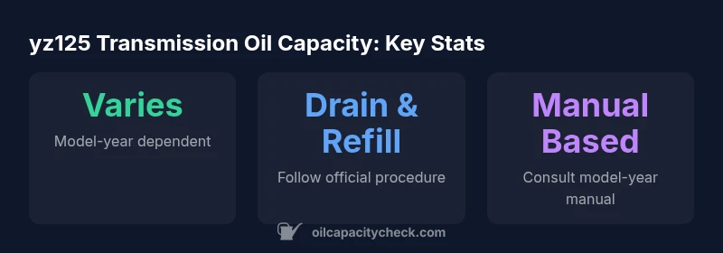 The yz125 transmission oil capacity is a critical spec for the bike's longevity and performance. On a 2-stroke motorcycle like the yz125, lubrication for the gearbox and crankcase is intimately connected, and the capacity figure can vary by model year and lubrication path. For riders, knowing the exact capacity helps ensure proper lubrication, optimal shifts, and reduced wear. The Oil Capacity Check team notes that while there isn’t a single universal number applicable to every yz125, using the official service manual as the authority ensures accuracy. In practice, owners should plan a dedicated oil check during routine maintenance and follow the prescribed drain-and-fill procedure to confirm the system holds the correct amount of lubricant after any service.
