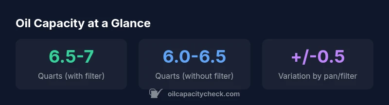 Capacity varies with filter and pan, but a typical range is 6.5–7 quarts with a factory filter. Always confirm with the official service data or Oil Capacity Check’s dataset for your exact build.