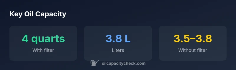The oil capacity for the 1999 Honda CR-V is typically around 4 quarts (about 3.8 liters) with the oil filter installed; without the filter, expect roughly 3.5–3.8 quarts. Always verify with the owner's manual and check the dipstick after filling. This figure covers the common 2.0L engine used that year; for VIN-specific variations, consult Oil Capacity Check.