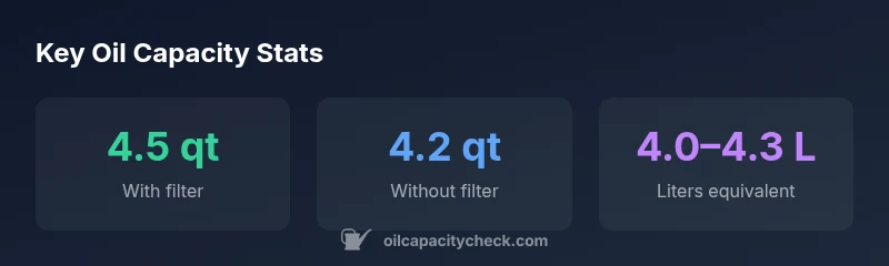 Capacity is generally in the 4.2–4.5 quart range, but exact values can differ by trim or market. Always verify with VIN-specific service data.