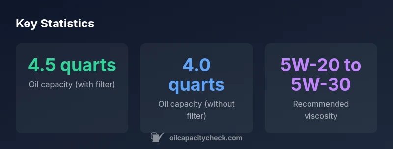The typical capacity with a new filter is about 4.5 quarts, with about 4.0 quarts without the filter. Always verify with the dipstick after a change, as exact amounts can vary by market and engine variant.