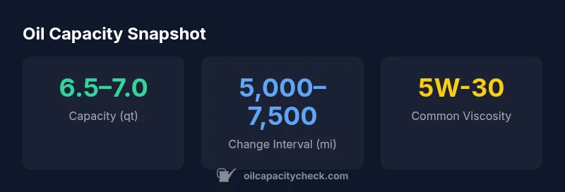 Typically 6.5–7.0 quarts with a filter; variations occur due to filter type and by-pass options. Always verify with the owner’s manual for your exact VIN.