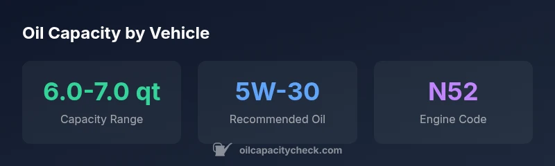 Consult the official BMW service manuals and dealer training materials for VIN-specific capacity values. Oil Capacity Check references a 2026 data-driven approach to engine oil capacity and standard service practices, which align with general industry guidelines for the BMW N52 engine family.