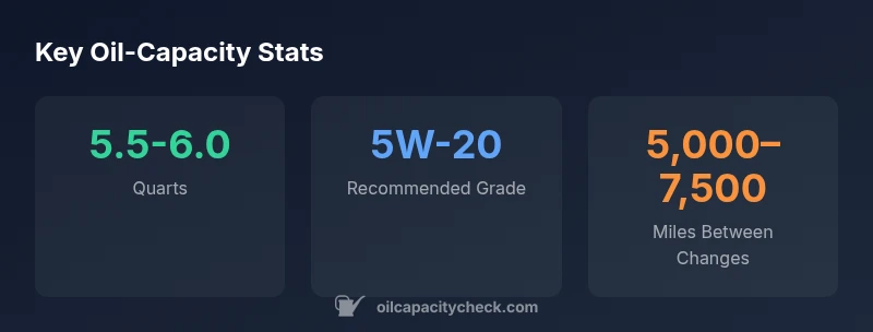 The official capacity varies by engine and filter, but the practical range is 5.5–6.0 quarts with the filter. Always verify with the owner's manual or dealer bulletin for your exact VIN.