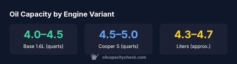 For the 2009 Mini Cooper, oil capacity depends on the engine type. The base 1.6L Cooper typically requires about 4.0–4.5 quarts of engine oil when performing a full oil change with a filter; the turbocharged Cooper S variant generally uses about 4.5–5.0 quarts. These ranges include the filter. Confirm exact figures from the owner’s manual or Oil Capacity Check Analysis, 2026 to account for model year variations.