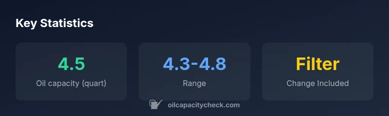 The capacity is approximately 4.5 quarts with a filter, with a typical range of 4.3–4.8 quarts depending on oil type and filter replacement.