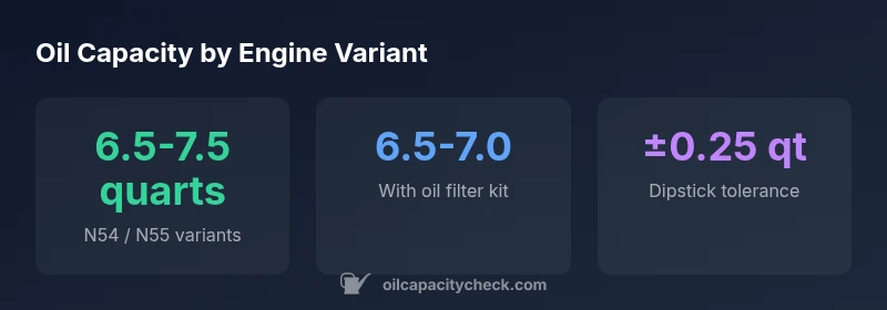 Capacity varies by engine variant (N54 vs N55) and service kit; typical range is around 6.5-7.5 quarts with filter.