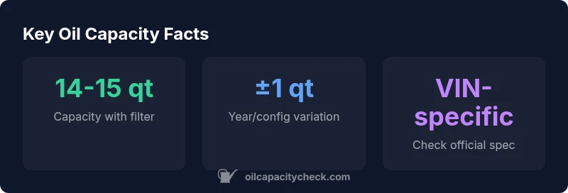 Official figures vary by configuration, but the typical range is mid-teens of quarts when the filter is included. Always confirm with VIN-specific Ford specs and the owner's manual.