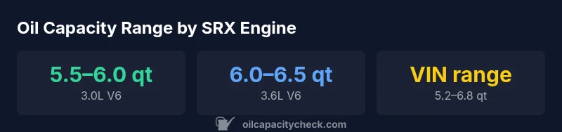 Oil capacity for the 2012 SRX varies by engine; expect roughly 5.5–6.5 quarts with filter. Check your VIN for the exact figure and consult your owner's manual. See our detailed chart for engine-specific values.