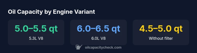 For the 5.3L V8, the oil capacity is typically within the 5.0–5.5 quart range when including the filter. Exact values depend on the filter size and production variant. Always verify with the owner’s manual and recheck with the dipstick after filling.