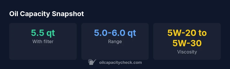 The capacity with the filter is typically around 5.5 quarts, within a 5.0–6.0 quart range depending on the exact engine variant and filter. Always verify with the dipstick after a cooldown.