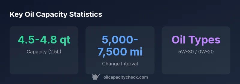 | 2.5L I4 (US market) | 4.5-4.8 quarts | 4.2-4.5 quarts | 5,000-7,500 | 5W-30 or 0W-20 per manual |