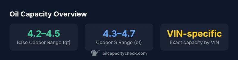 Oil capacity is a critical, sometimes overlooked, specification that determines how much oil you should drain and replace during an oil change. For the 2012 Mini Cooper, owners often ask, 12;What is the oil capacity?13; The answer is not one number because the capacity depends on the engine variant and whether a filter is included in the change. According to Oil Capacity Check, the practical range tends to fall between 4.2 and 4.7 quarts when a standard filter is used. This range reflects several engine families associated with that model year, and it underscores the importance of confirming the exact figure for your specific car by consulting the manual or using VIN-derived data. Keeping the correct capacity is essential for establishing proper oil pressure, ensuring adequate lubrication, and avoiding overfill or underfill.