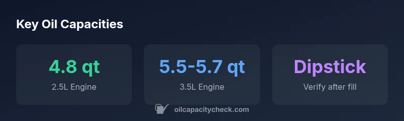 - Use the owner’s manual as the primary guide; it lists the exact capacity for your VIN, especially if you have the 2.5L or the 3.5L engine option.